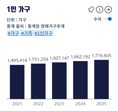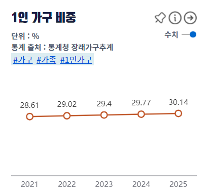 전체 가구 중 1인가구수는 160만 7,147가구로 전체 가구 중 29.4%의 비중을 차지한다.
