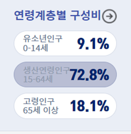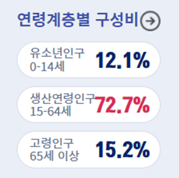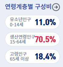 대한민국의 고령인구 비중은 18.4%로 유소년 인구 11.0% 대비 1.67배 더 많다.