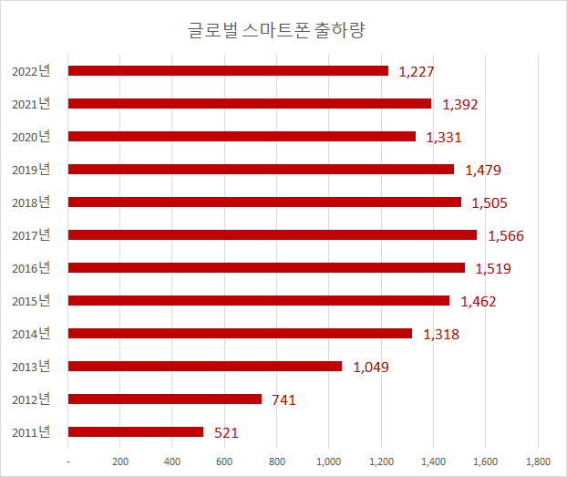 글로벌 스마트폰 출하량은 2022년 기준 1,227백만대로 2021년대비 -11.9% 감소한 수치를 기록했다.