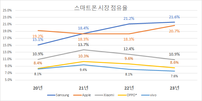 23년 1분기 스마트폰 시장 점유율은 삼성 21.6%, 애플 20.7%, 샤오미 10.9%, 오포 8.6%, 비보 7.6%, 기타 30.7%다.
