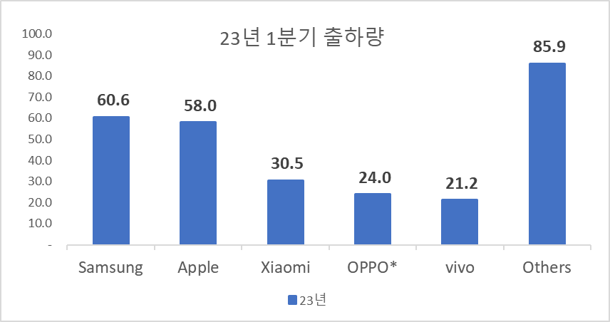 23년 1분기 스마트폰 시장 점유율은 삼성 21.6%, 애플 20.7%, 샤오미 10.9%, 오포 8.6%, 비보 7.6%, 기타 30.7%다.