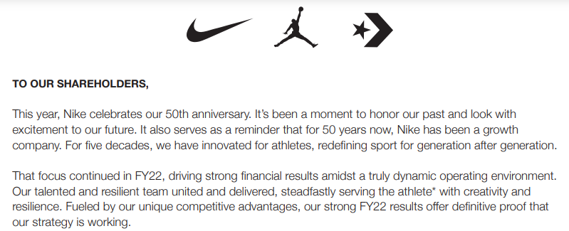 2022년 나이키의 주주서한 일부. 50주년 축하와 함께 22년의 강력한 재무적 성과에 대한 내용을 강조함(출처:나이키 홈페이지)
