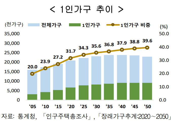 통계청이 추산한 바에 따르면, 2050년이 되면 1인 가구의 비중이 39.6%까지 증가할 것으로 예상된다.