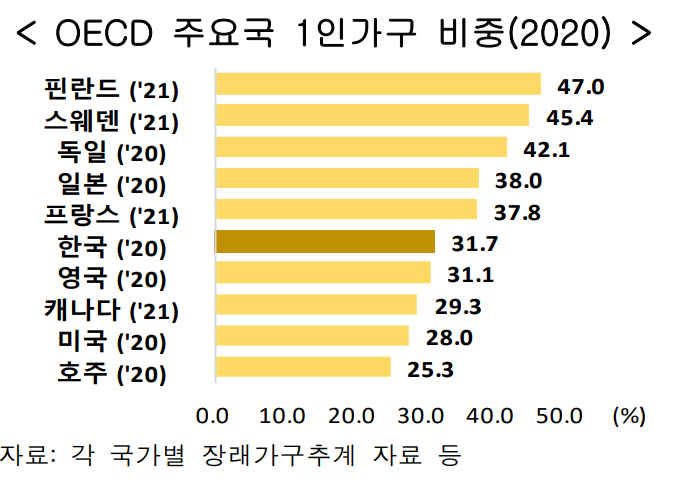 OECD 국가 중 1인 가구 비중이 가장 큰 나라는 핀란드로 47%에 달한다.