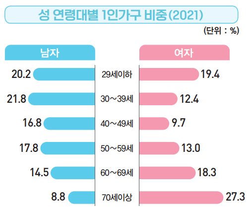 남성 중에서 1인 가구 비중이 가장 높은 것은 30~39세 남성으로 21.8%의 비중을 차지하고, 29세 이하의 남성이 20.2%로 두번째로 높은 비중을 차지한다. 40대와 50대는 남성과 여성 모두 가장 낮은 1인 가구 비중을 보이고 있다. 당연하게도 가족 구성이 많은 시기이기 때문이다.