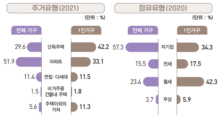 전체 가구의 57.3%는 자기집에서 살고 있지만, 1인 가구 중 자기집에 거주하는 비중은 34.3%였고, 42.3%의 1인 가구는 월세로 살고 있는 것으로 나타났다.
