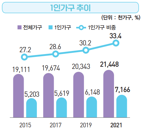 1인 가구는 지속적으로 증가 추세에 있는데, 지난 2015년 기준으로 1인 가구수는 520만 가구로 전체 가구 중 27.2%의 비중을 차지했다. 1인 가구수는 매년 지속 상승 중이고, 2019년 30%를 넘긴 이후 증가 속도가 더욱 커지고 있다.