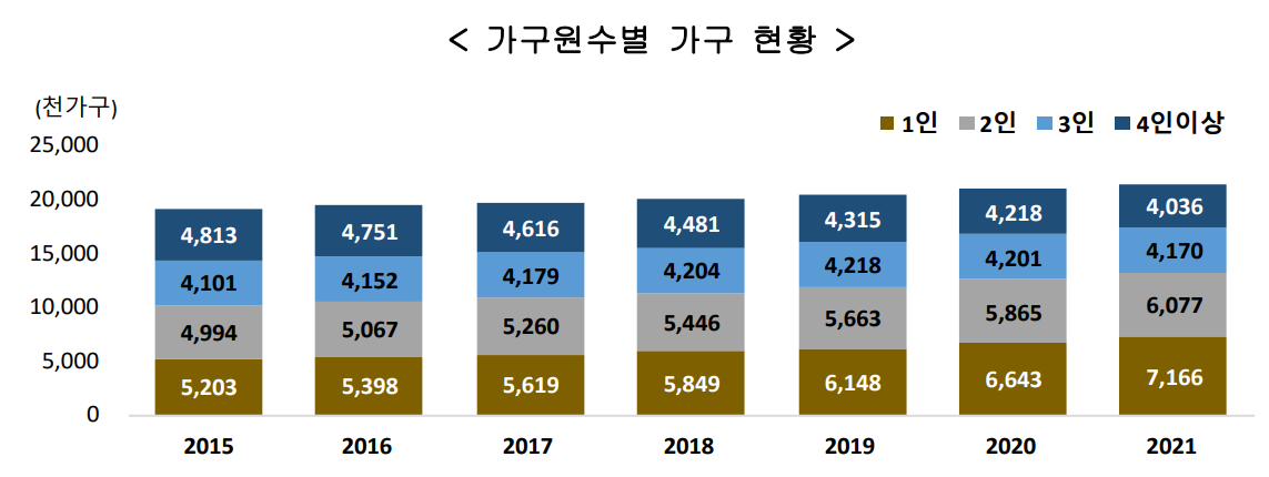 통계청 발표에 따르면, 2021년 기준 전체 가구수는 2,144만 가구다.