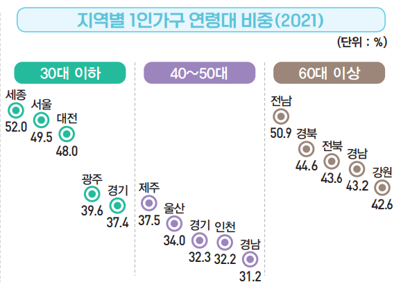 각 지역별로 1인 가구의 연령대별 비중을 살펴보면, 30대 이하의 1인 가구 비중이 가장 옾은 곳은 세종, 서울, 대전 등 기업과 정부 청사가 많은 곳이었다. 직장 때문에 독립한 젊은 세대가 많은 것이다.