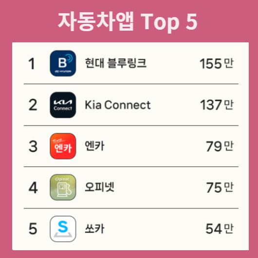 2위는 Kia Connect 137만명, 3위는 엔카 79만명, 4위 오피넷 75만명, 5위 쏘카 54만명입니다.