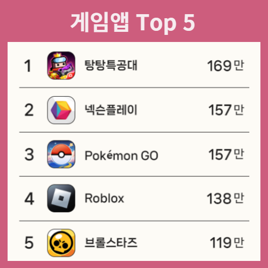 2위는 넥슨플레이 157만명, 3위는 포케몬고 157만명, 4위 로블록스 138만명, 5위 브롤스타즈 119만명입니다.