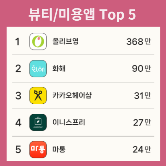 뷰티/미용앱의 1위는 올리브영으로 368만명이 사용 중입니다.