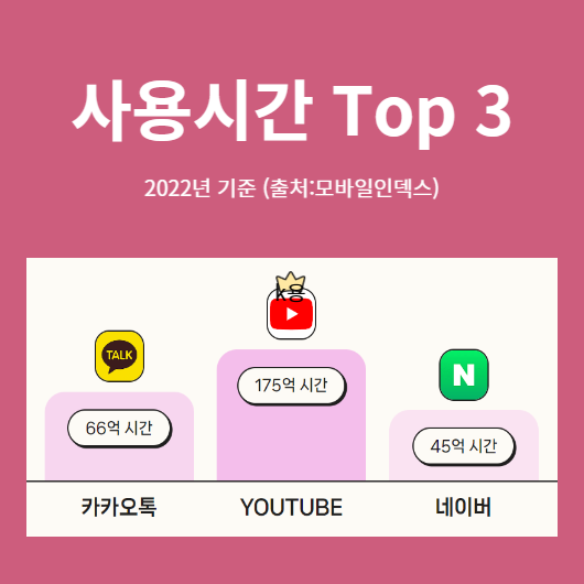 총 사용 시간 기준으로 유튜브 175억 시간, 네이버 66억 시간, 네이버 45억 시간 순입니다.