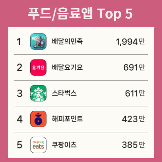 2위는 요기요 691만명, 3위 스타벅스 611만명, 4위 해피포인트 423만명, 5위 쿠팡이츠 385만명입니다.