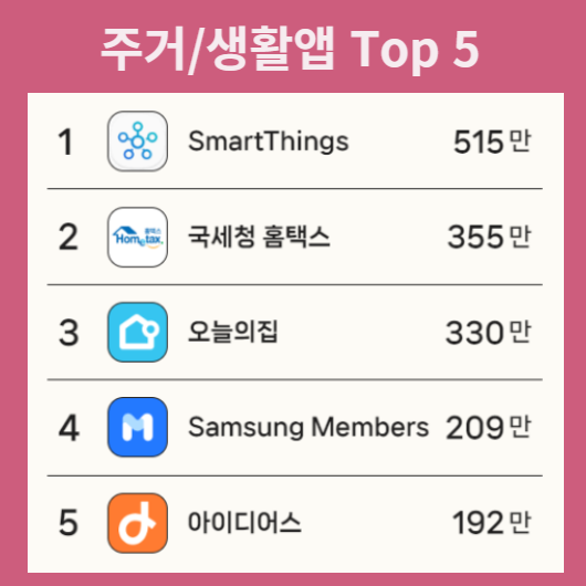주거/생활앱의 1위는 스마트띵즈 SmartThings 515만명이 사용 중입니다.