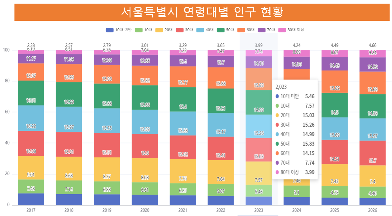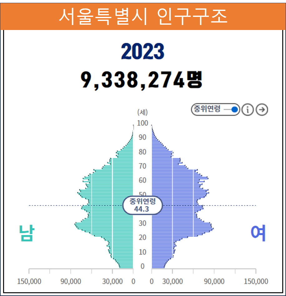 서울시 전체 인구를 나이별로 줄세웠을 때 중간에 있는 시민의 중위연령은 44.3세이다.