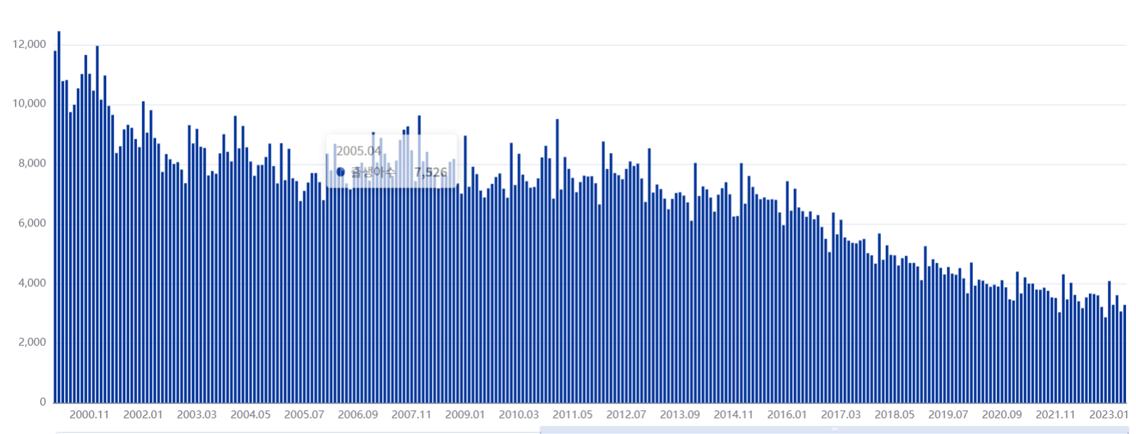 아래 그래프는 지난 2000년부터 23년까지 월별 출생아수 숫자를 추세로 나타낸 그래프인데,