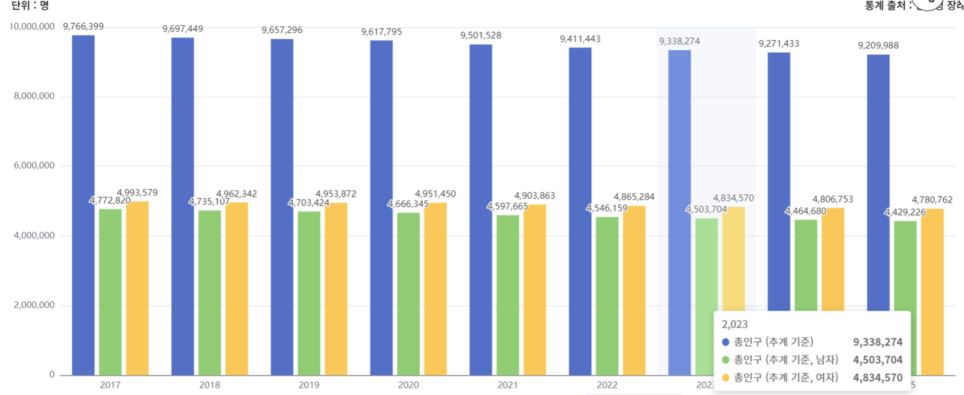 2023년 현재 서울시 인구는 총 933만 8,274명이다.