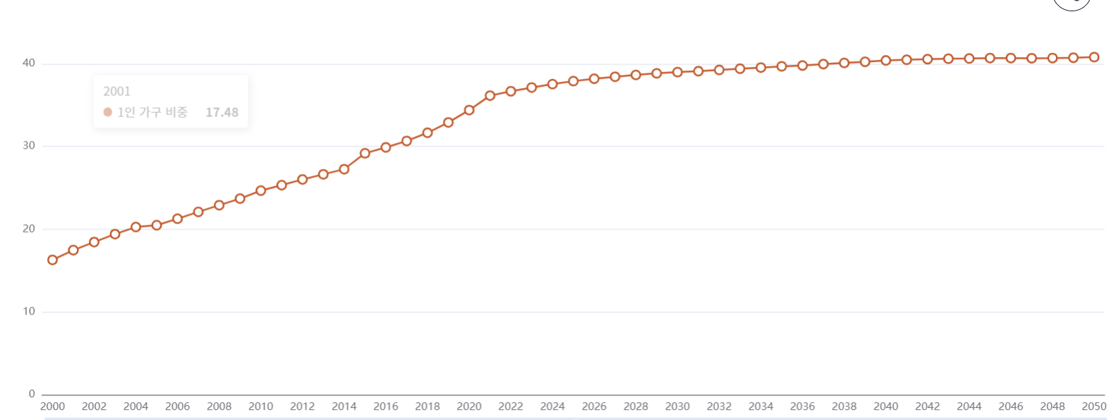2050년 1인 가구 비중은 40.8%까지 확대될 것으로 예상된다.