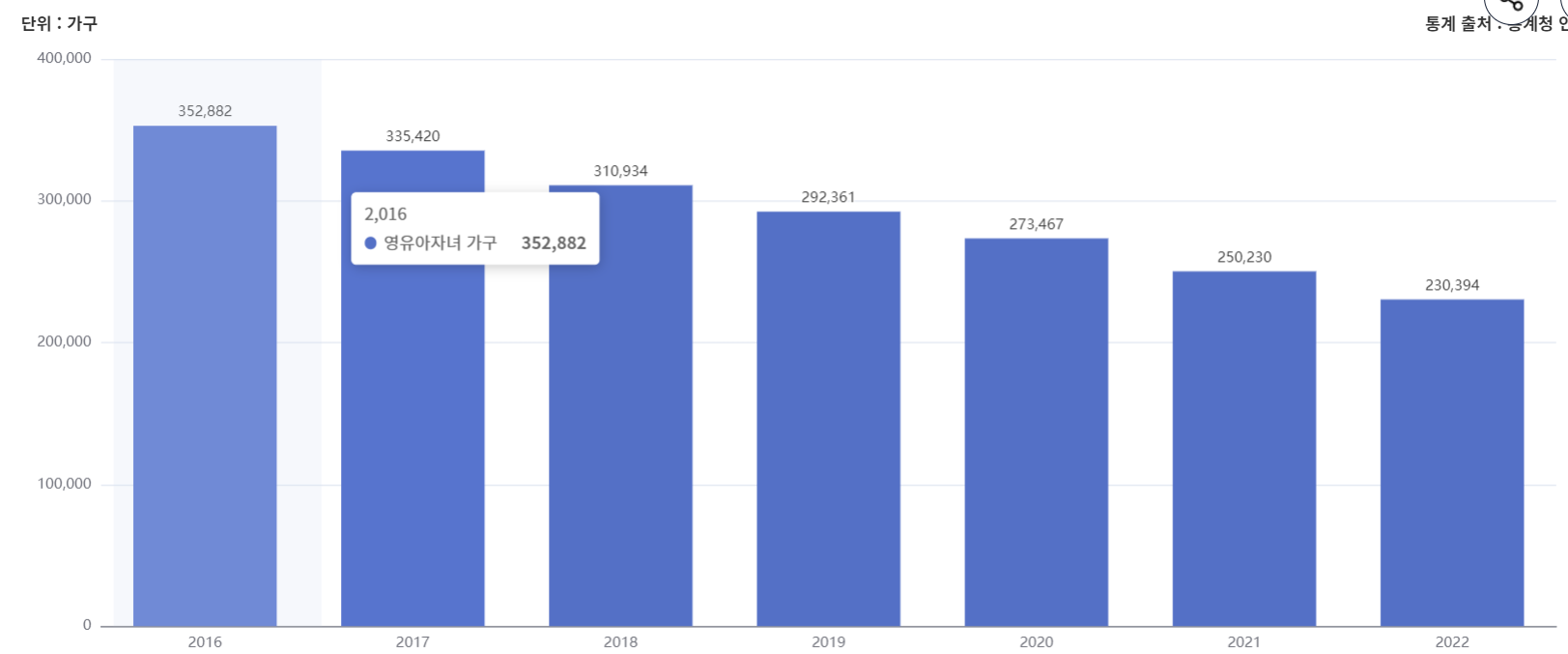 지난 2016년 352,862가구에서 6년만에 12만 가구가 감소한 수치로 거의 1/3이 줄어들었다.