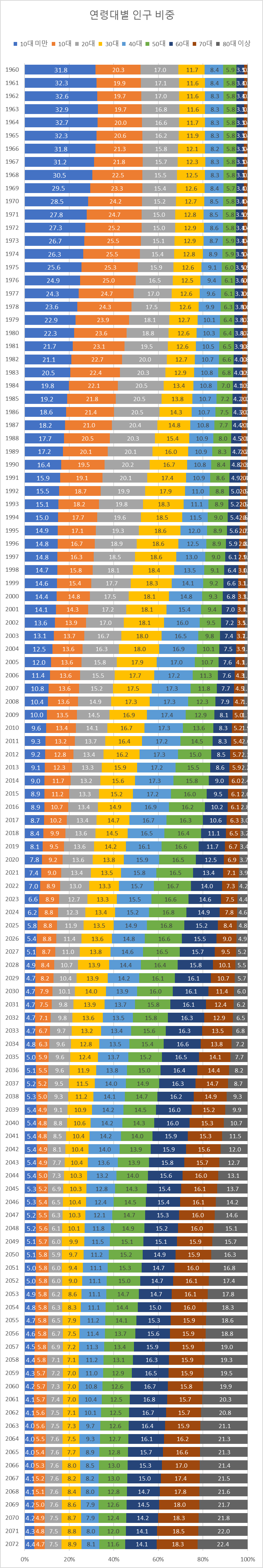 2) 연령대별 인구 비중 테이블 (1960~2072년)