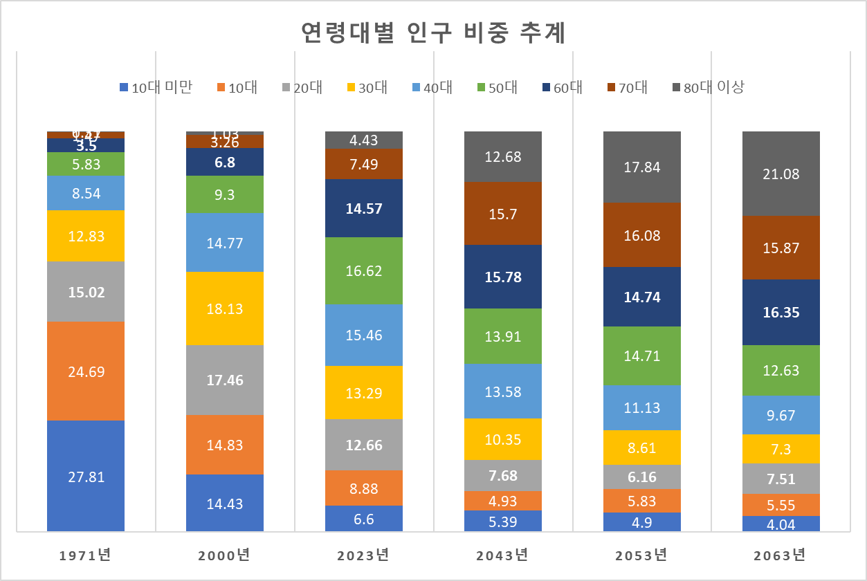 그리고 지금부터 20년 후, 그들이 70대가 되는 2043년에는 15.7% 비중으로 역시 60대와 유사한 수준으로 많은 인구비중을 차지하게 됩니다.