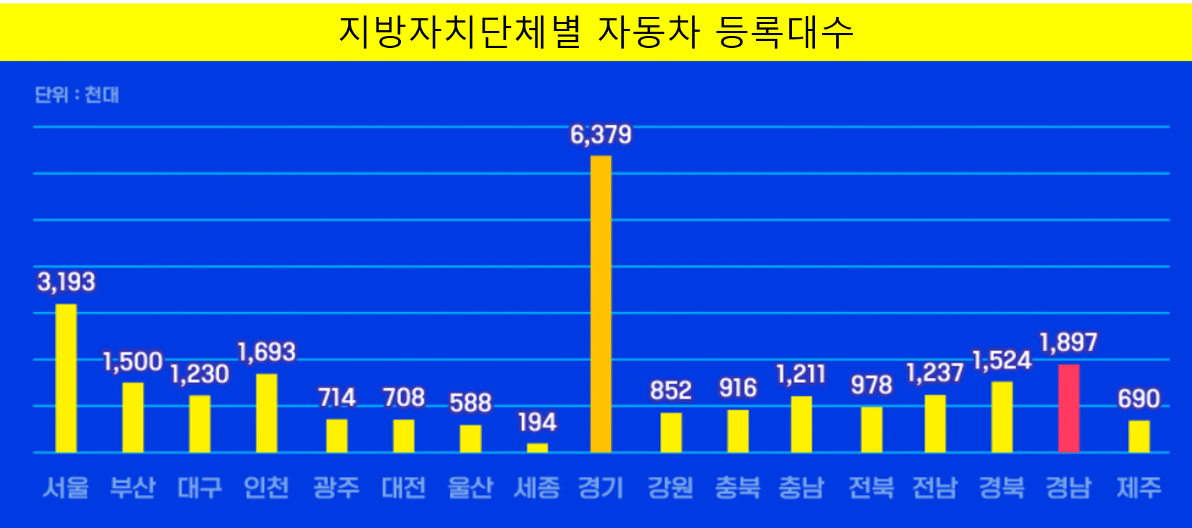 - 가장 많은 자동차 등록대수를 가진 지자체는 경기도로 637만 9천대의 자동차가 등록되어 있다.
