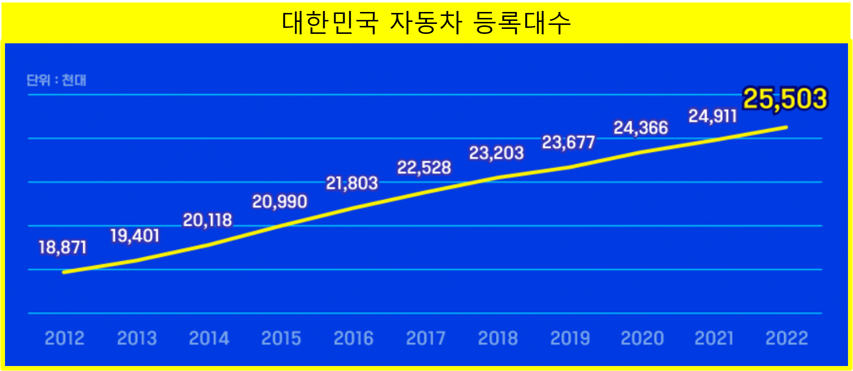 - 우리나라 자동차 등록대수는 2022년 현재 2,550만 3천대다.