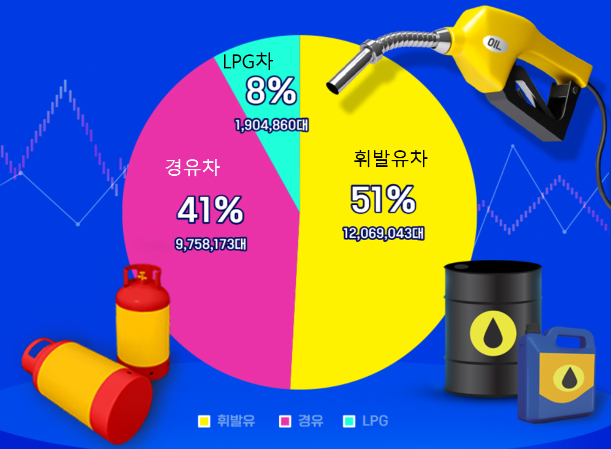 - 휘발유차가 전체 자동차의 51%고, 경유차가 41%, LPG차가 8%다.