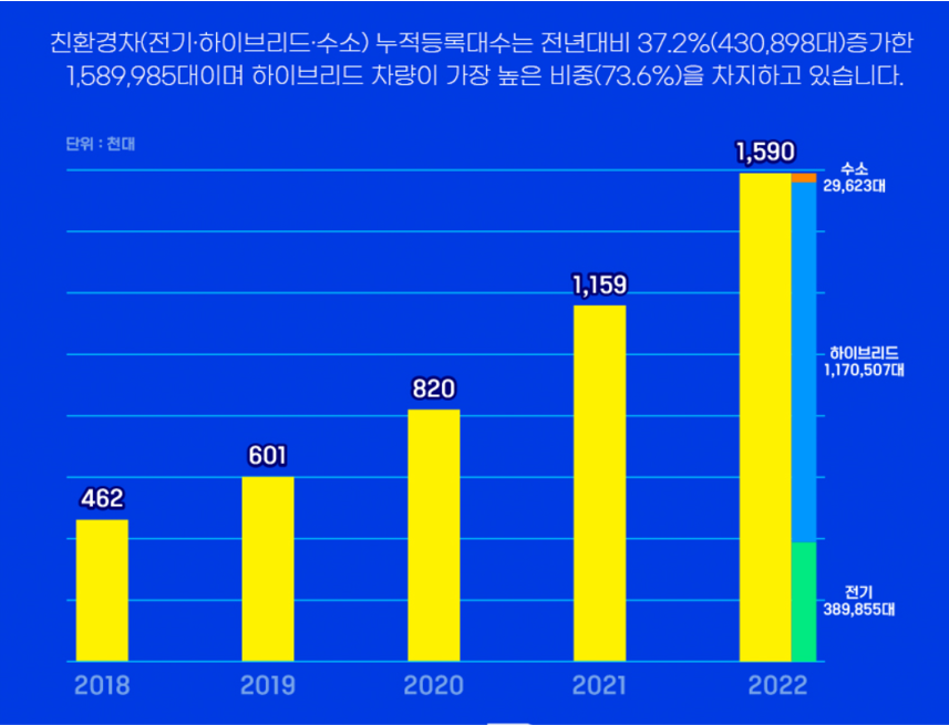 - 친환경차 등록대수는 2022년 기준 총 159만대다.