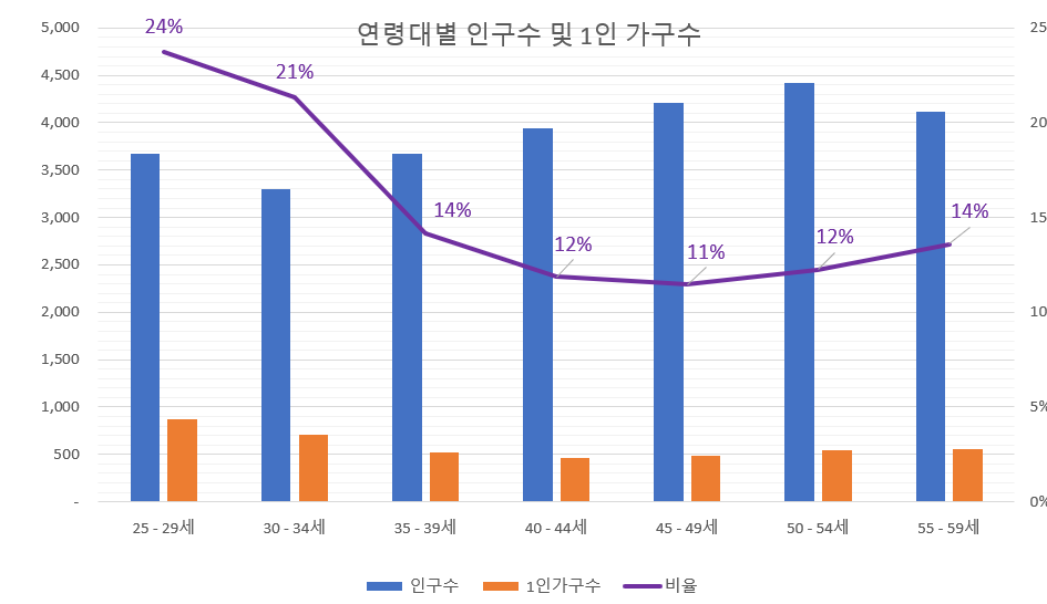 이에 따라, 25~29세의 24%와 30~34세의 21%가 혼자 사는 1인 가구 형태를 띄고 있다.