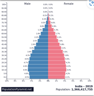 인도의 경우에는 출생률이 높은 관계로 아래로 내려갈 수록 더 많은 인구수를 가지고 있다.
