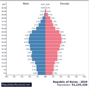 한국의 인구 피라미드가 40대를 정점으로 점점 더 적은 인구수를 가지면서 아래가 점점 좁아지는 항아리형의 인구 피라미드를 보여준다.