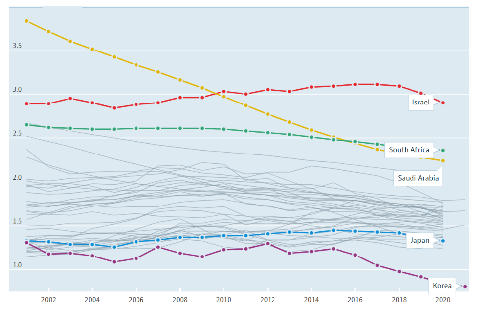 2002년 기준으로 가장 높았던 사우디 아라비아는 2002년 3.8 수준에서 2020년 2.3 수준까지 급격하게 하락하고 있다.