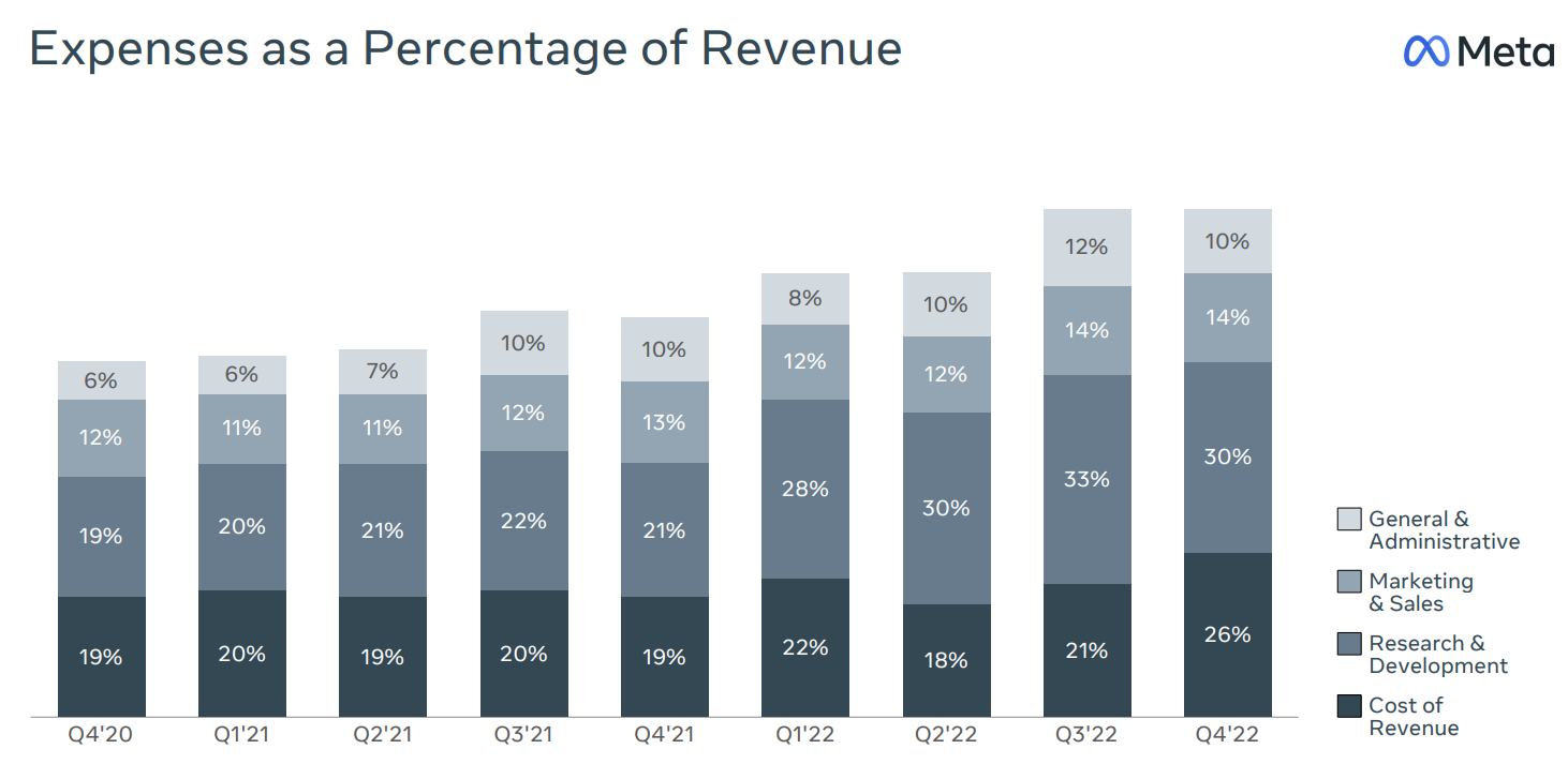 메타의 가장 큰 문제는 (상대적으로 이전 대비)방만한 경영과 메타버스로의 과다한 투자가 이익 구조를 악화시킨 요인이었다.