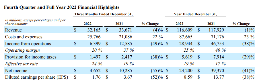 21년 전체 이익이 467.53억 달러였는데, 22년 전체 이익은 289.55억 달러로, 38%나 감소했다.