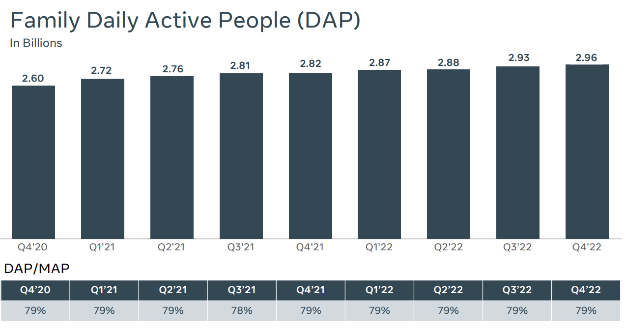 메타의 일 사용자는 22년 4분기 기준으로 29.6억명이다. 매일 29.6억명이 인스타그램이나 페이스북에 로그인을 해서 이미지를 올리고 글을 남긴다.