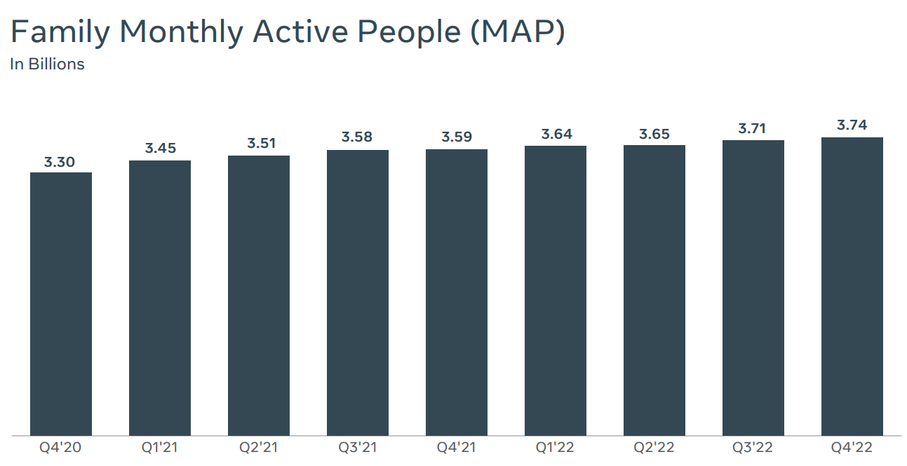 인스타그램 및 페이스북을 포함한 패밀리앱 전체에서 메타의 22년 4분기 월 사용자는 37.4억명이다.