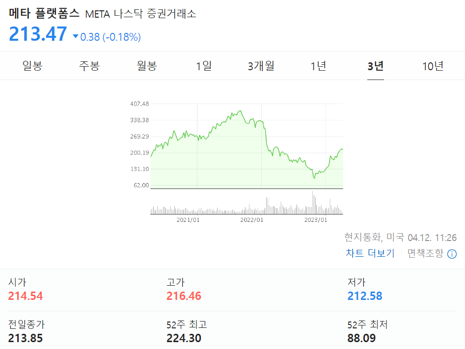 메타가 실적 하락에 따라 88달러까지 하락했다가 200불 위로 상승한 상황이다.