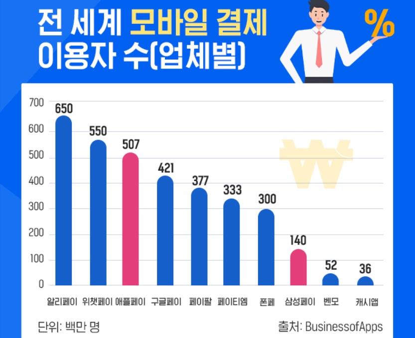 현재 전세계에서 중국의 알리페이와 위챗 페이를 제외하고 모바일 결제 이용자수가 가장 많은 간편결제 서비스가 바로 애플페이다. 글로벌에서 삼성페이는 1억 4천만명이 사용하고 있는데, 이는 애플페이의 5억 7백만명과 비교했을 때 매우 낮은 수치다. 삼성이 애플 페이의 국내 시장 진출에 대해 매우 경계할 수 밖에 없는 이유다.