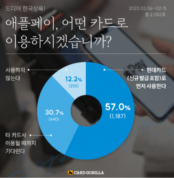 지난 2월 카드고릴라가 조사한 소비자의 애플 페이 이용 의향에 의하면, 소비자의 57%는 현대카드를 이용해서 애플페이를 사용하겠다고 답변했다. 현대카드 이 외의 타 카드사가 등록 가능할 때 까지 기다리겠다는 응답자는 30.7%다.