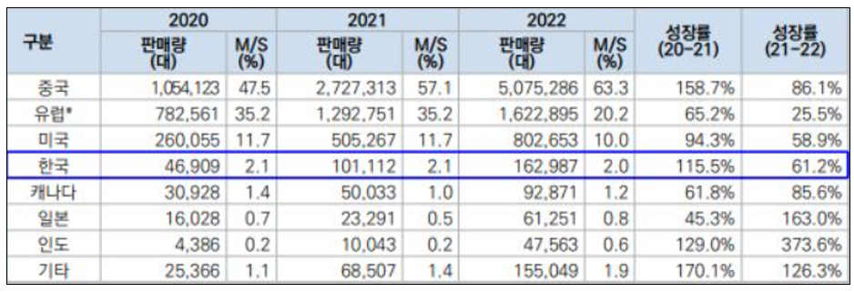 2023.04.22 - [경제경영통계] - 전세계 전기차 판매량, 성장율, 브랜드별 시장점유율