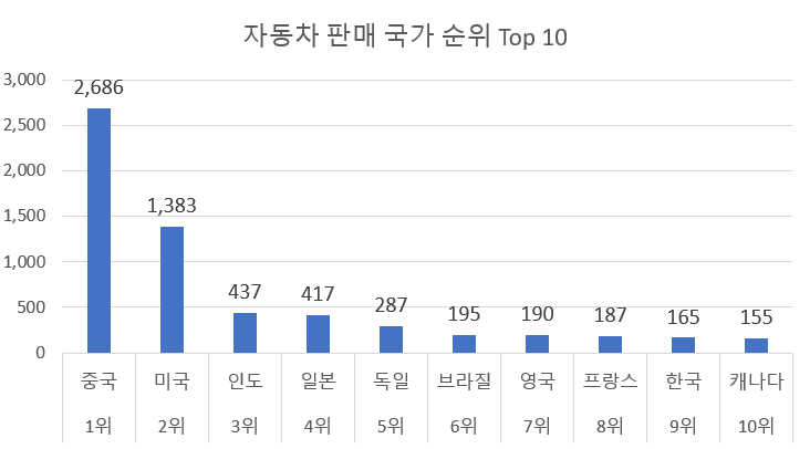 전세계에서 자동차가 가장 많이 팔리는 나라는 역시 인구가 많은 중국입니다. 2022년 중국에서는 2,686만대의 자동차가 팔렸습니다.
