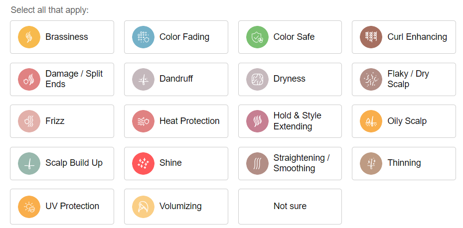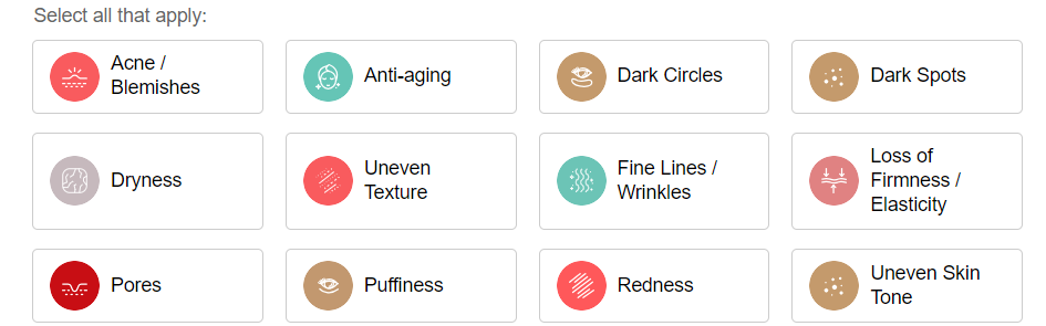 ② 피부 고민 Skin Concerns : 여드름, 안티에이징, 다크서클, 기미, 건조함, 매끄럽지 않음, 주름, 탄력 부족,
