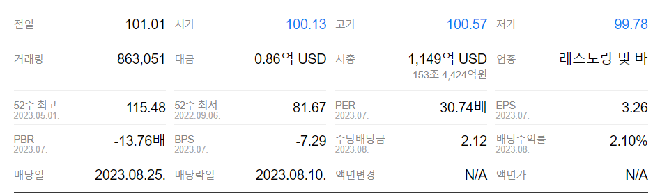 5년 그래프를 봐도 스타벅스의 주가는 21년 최고점 이후 실적의 22년 저점 81.67달러 대비로는 증가한 100달러 선.