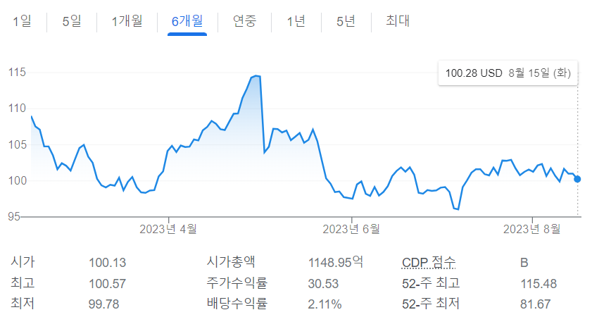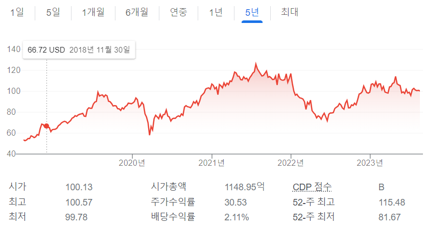5년 그래프를 봐도 스타벅스의 주가는 21년 최고점 이후 실적의 22년 저점 81.67달러 대비로는 증가한 100달러 선.