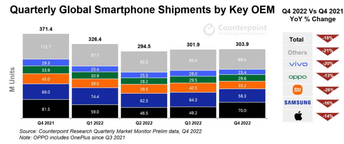 카운터 포인트의 발표에 따르면 2022년 전체 스마트폰 시장의 축소에도 불구하고 애플은 세계 M/S에서 가장 큰 성과를 올렸습니다.