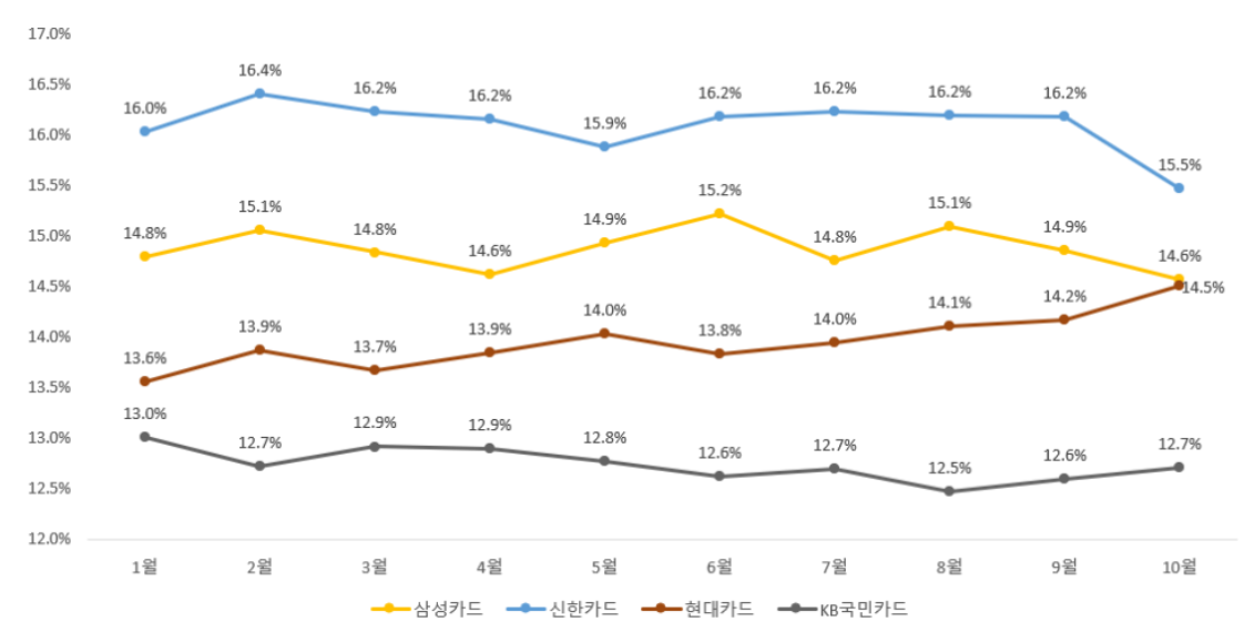 신한카드, 삼성카드, 현대카드, KB국민카드의 카드 결제 시장 점유율,22년 1~10월