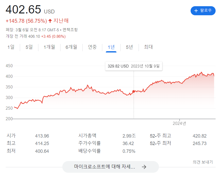 24년 3월 5일 종가 기준 애플의 시가 총액은 2.63조 달러이고 마이크로소프트는 2.99조 달러로 기업가치 1위는 기존 애플에서 마이크로 소프트로 넘어갔다.