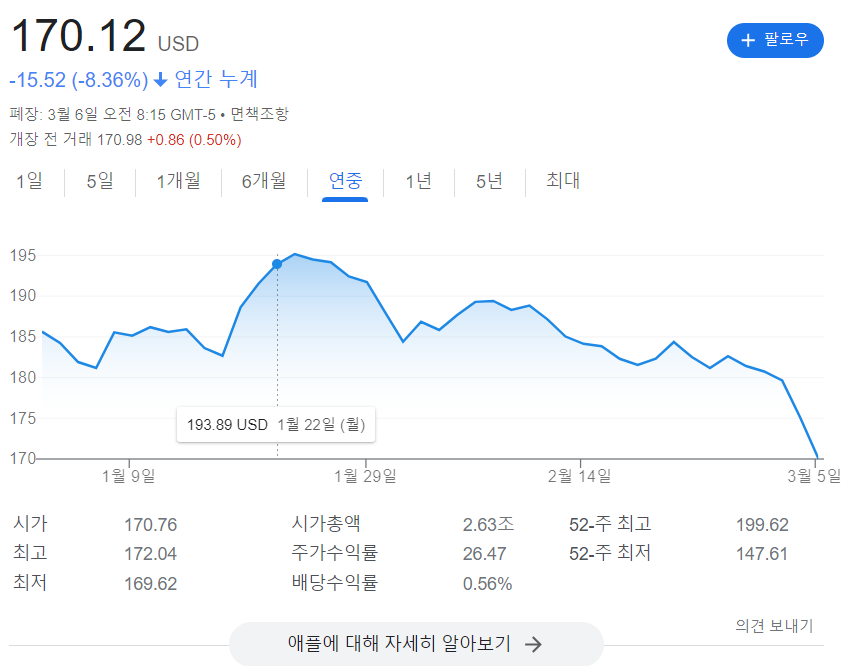 애플의 주가는 199.62달러를 고점으로 최근 하락세를 유지하고 있다. 큰 폭의 하락은 아니지만, 최근 AI 열풍에 빅테크 기업들의 주가가 지속 상승하는데 비해 애플은 소외되고 있는 느낌이다.